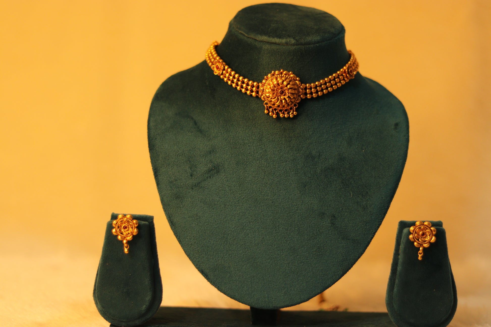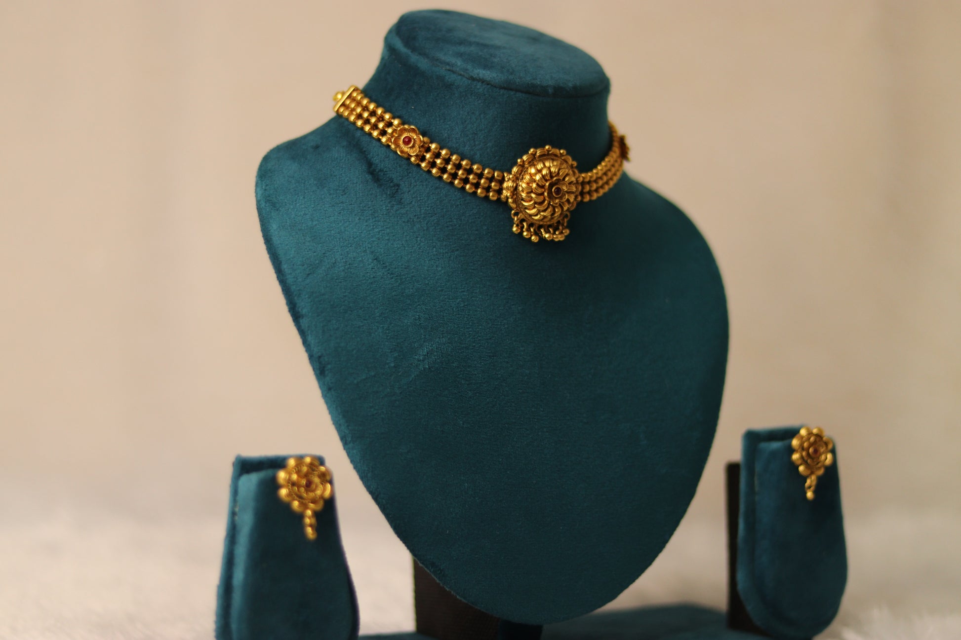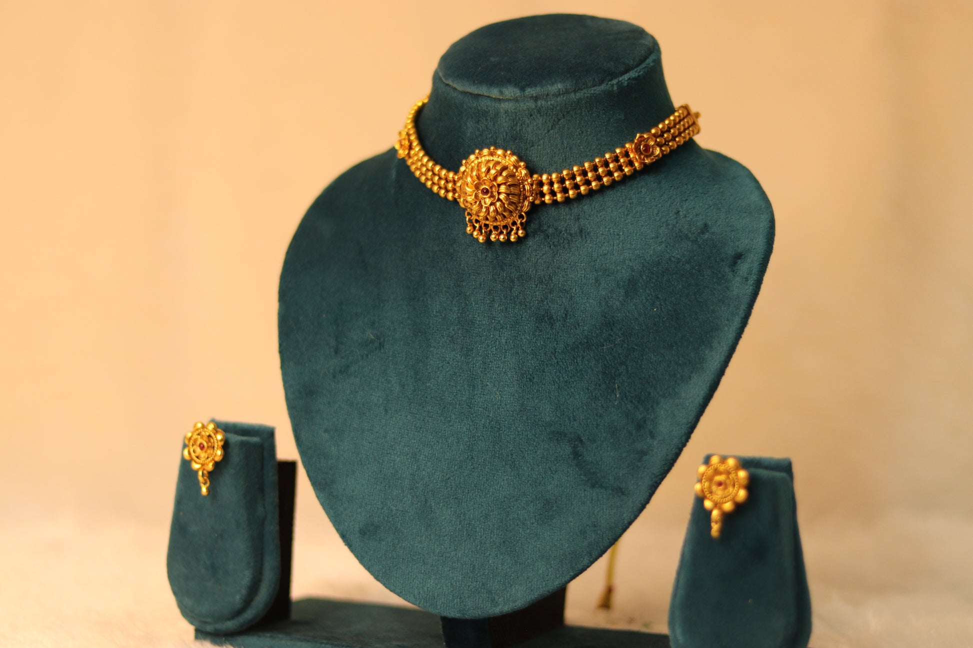 antique gold plated choker necklace set with floral pendant and matching earrings. Lightweight and stylish, ideal for daily use, small functions, and casual traditional outfits.