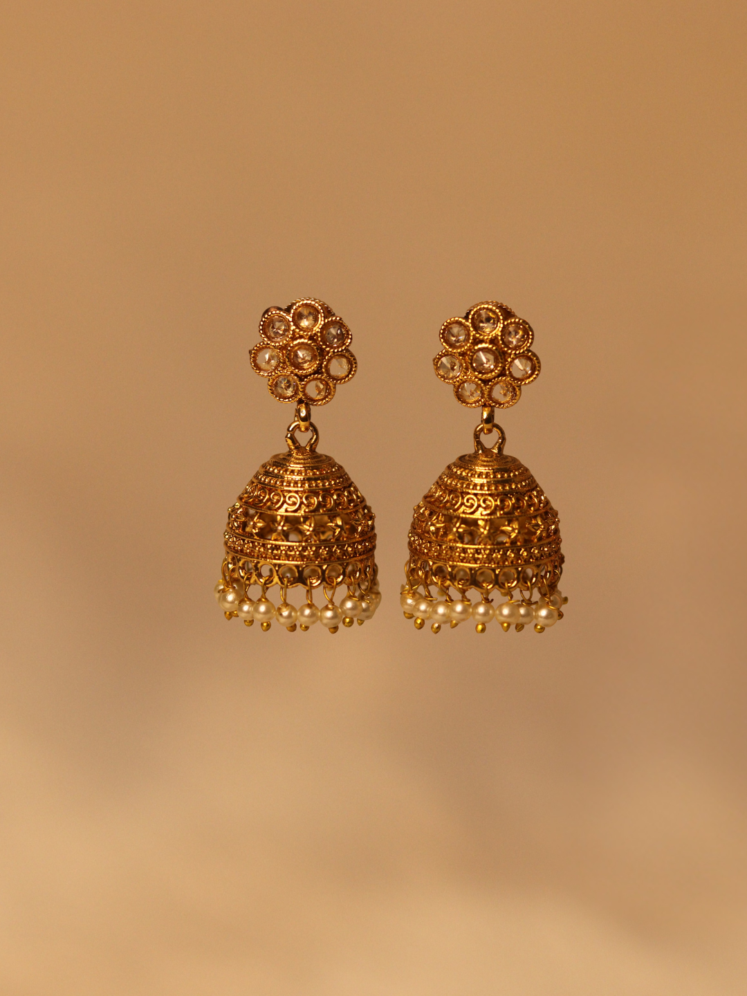 “Bathed in golden radiance and adorned with delicate pearls, these premium temple jhumkas are crafted to celebrate your divine charm.