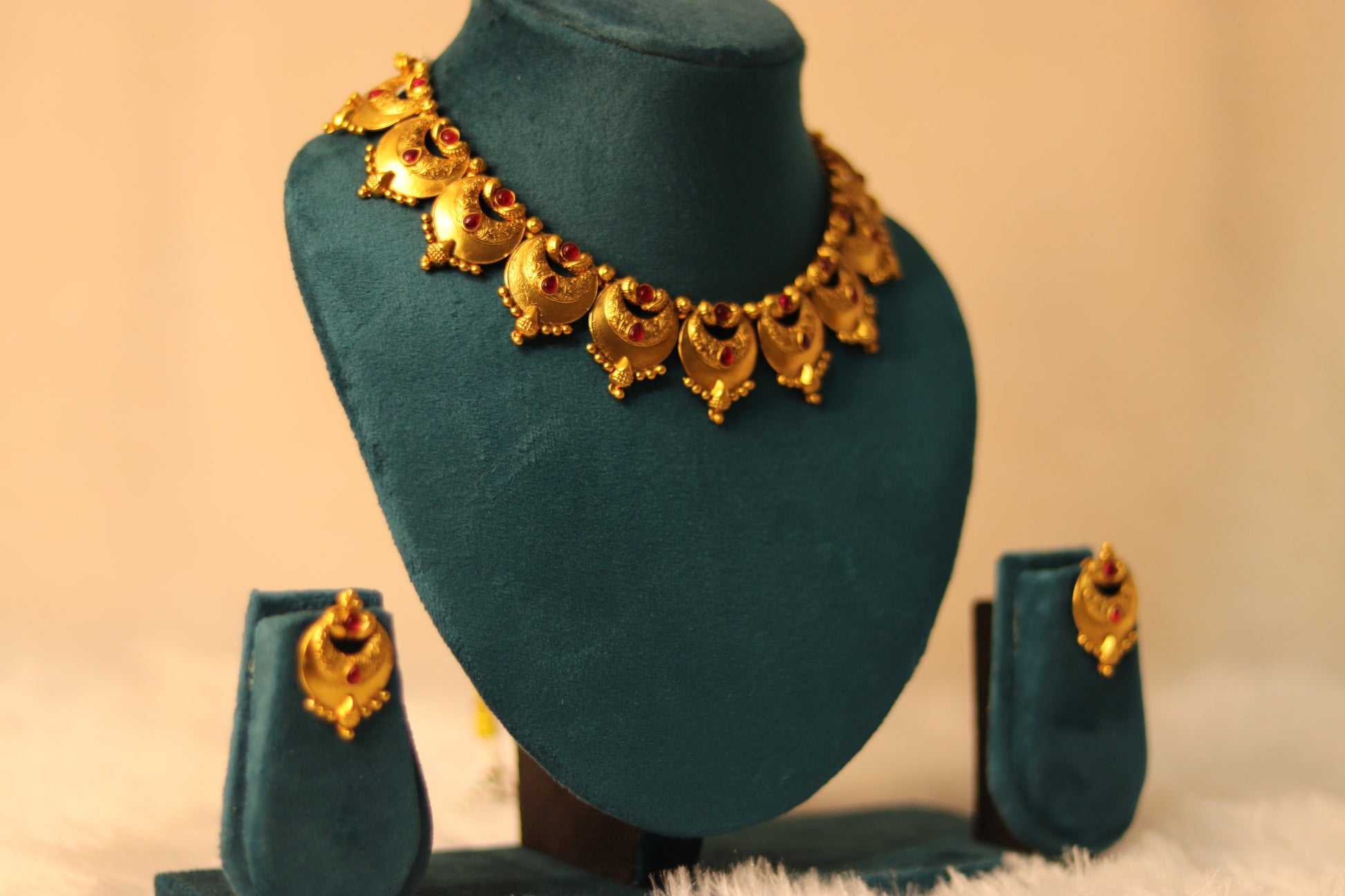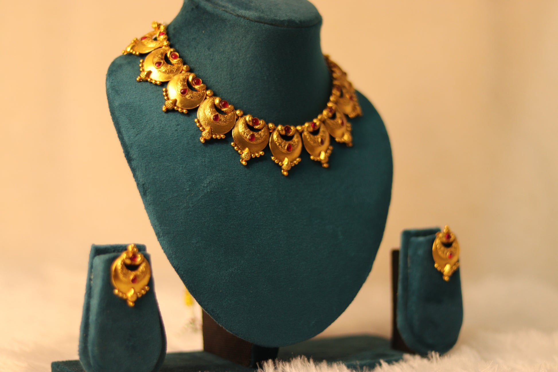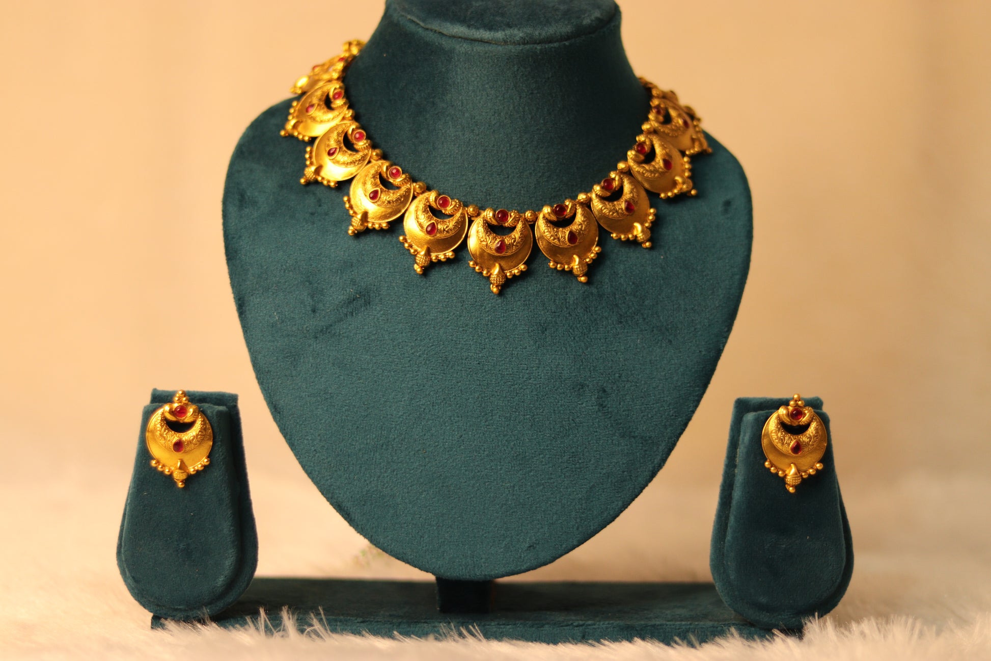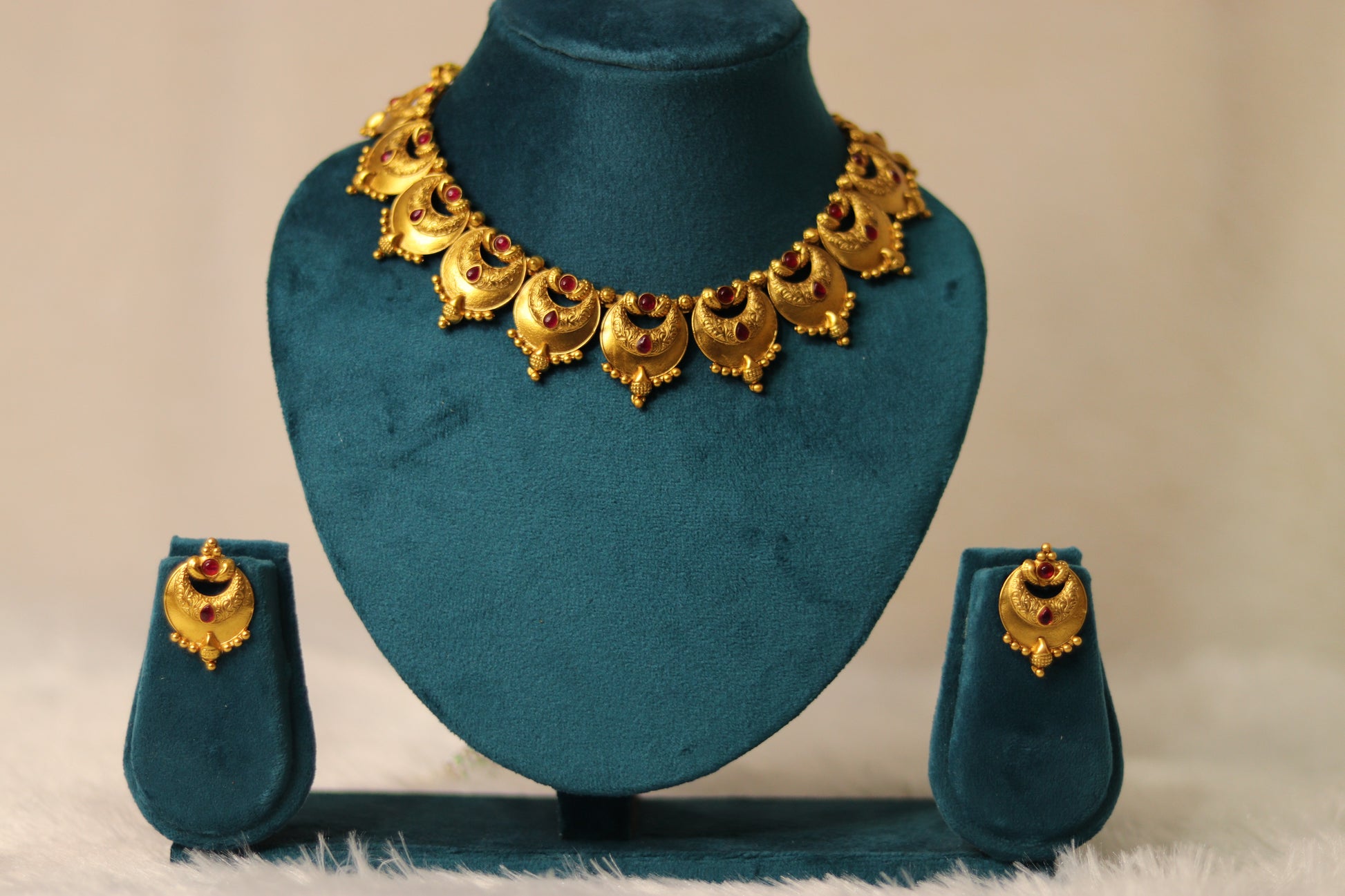 Elegant antique gold plated choker necklace set featuring crescent motifs with ruby red stone detailing. Comes with matching earrings. Perfect for festive occasions, weddings, and cultural celebrations.