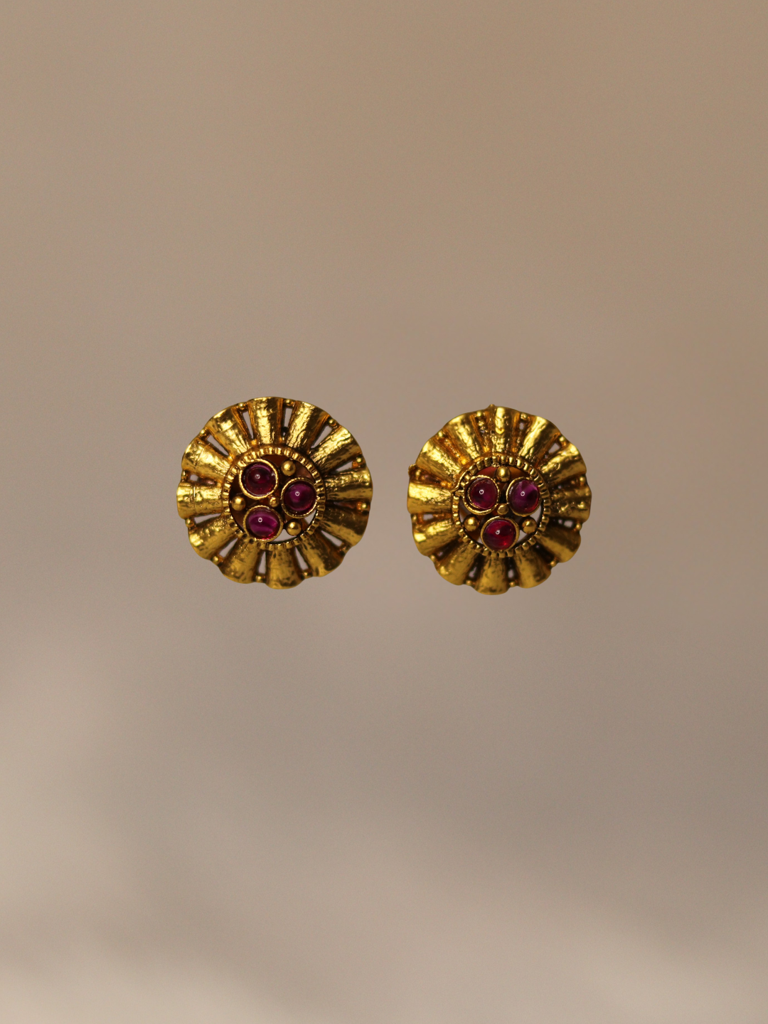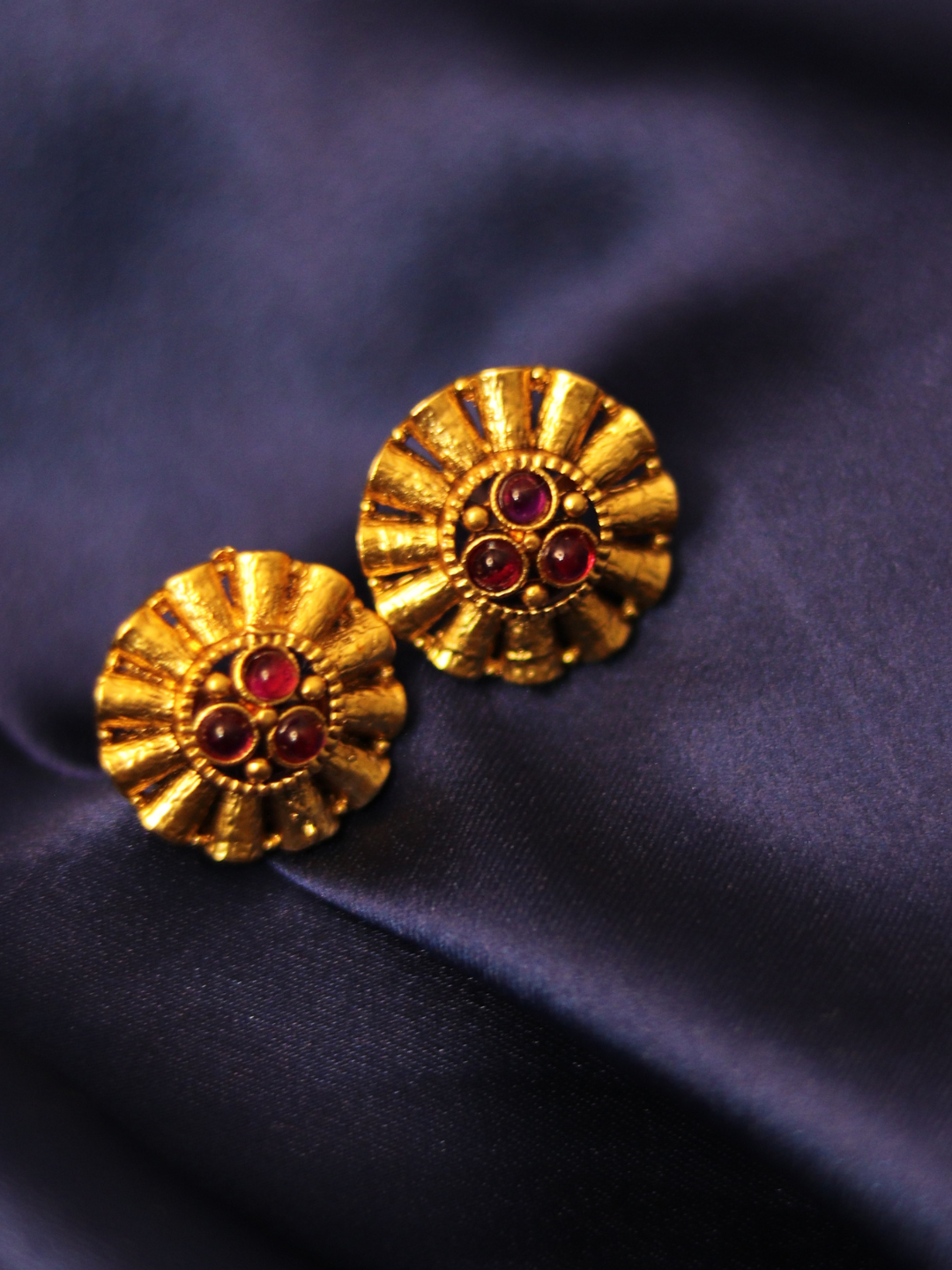 These antique gold-plated temple tops with a striking red stone bring the charm of heritage to your modern celebrations.