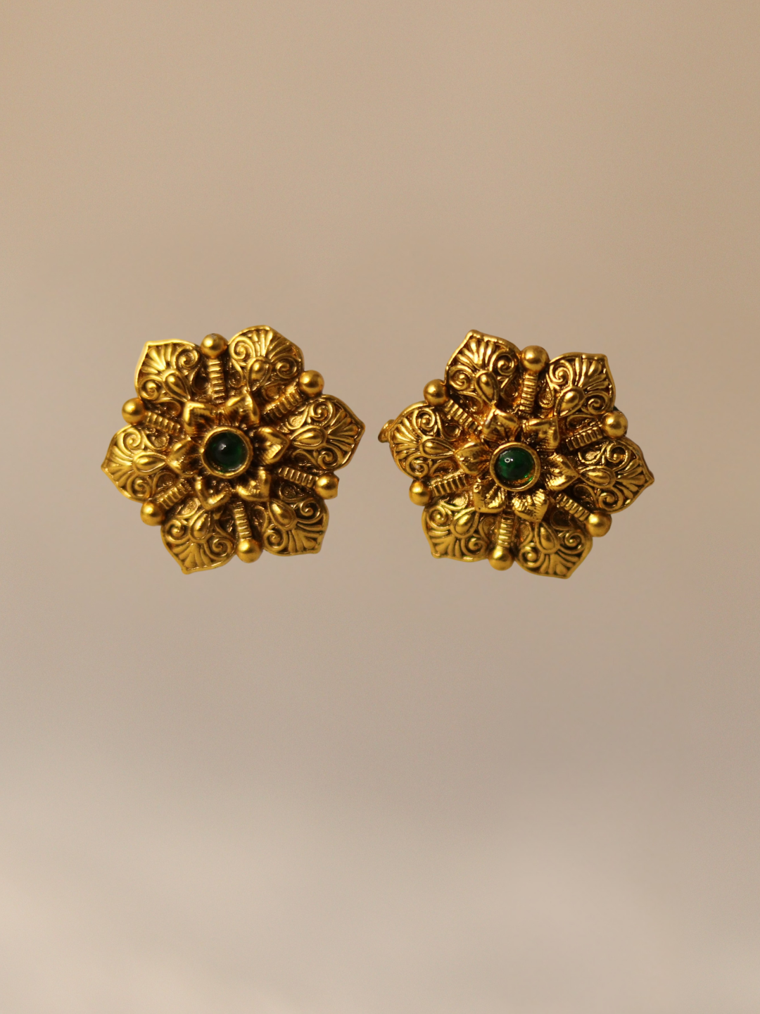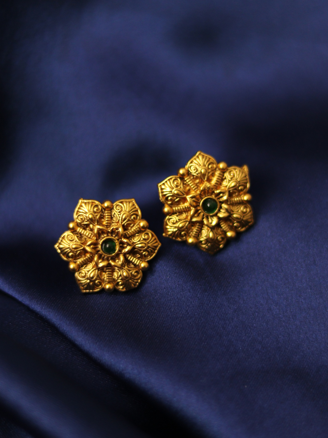Rooted in the heritage of South Indian temple jewelry, these antique gold plated tops are adorned with shimmering red stones that symbolize prosperity and devotion. Handcrafted with intricate detailing, they are not just ornaments but a reflection of spiritual artistry — making them an ideal choice for celebrations and sacred occasions.