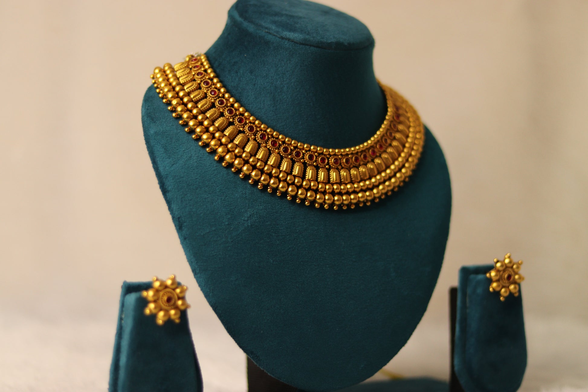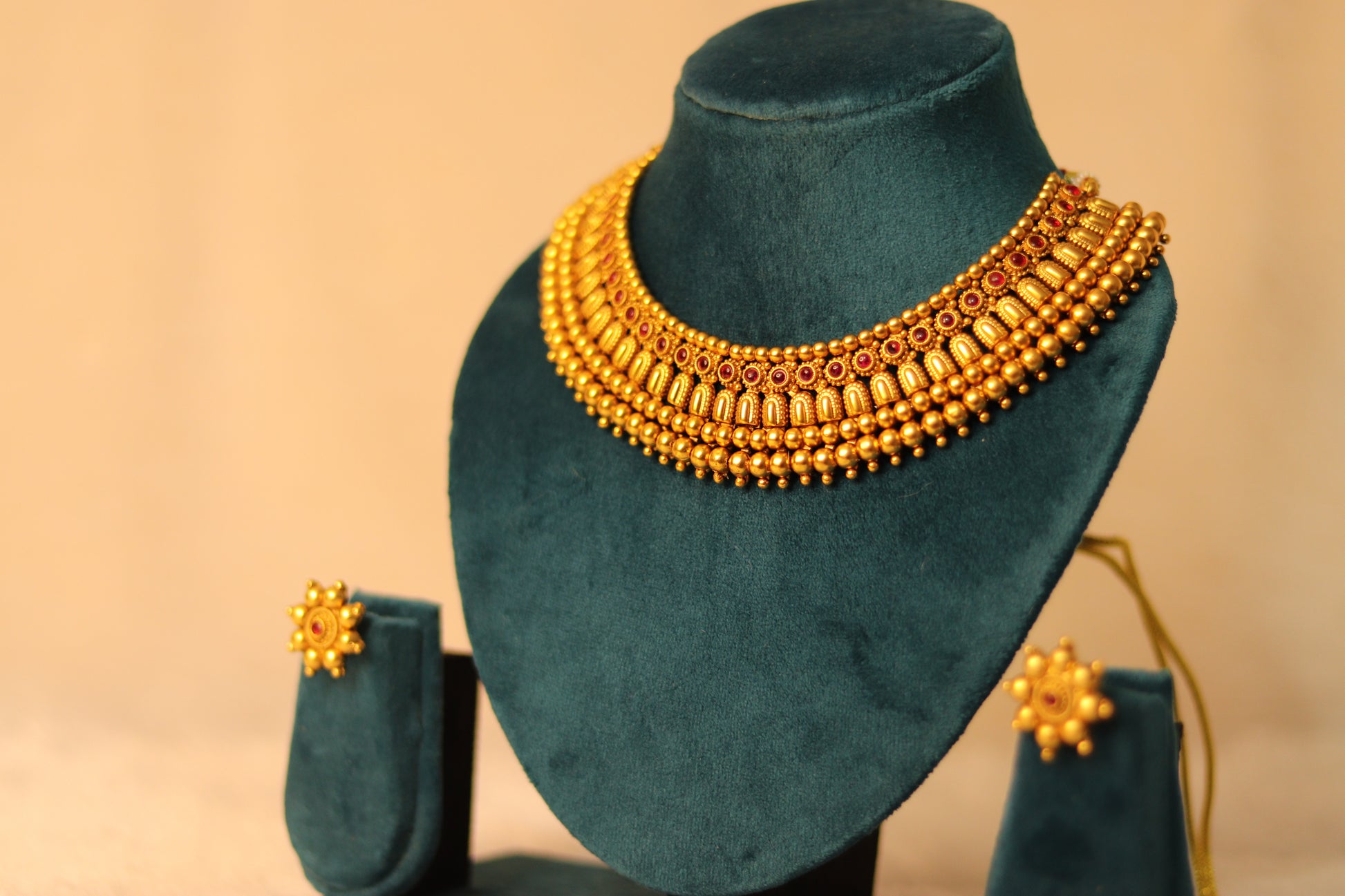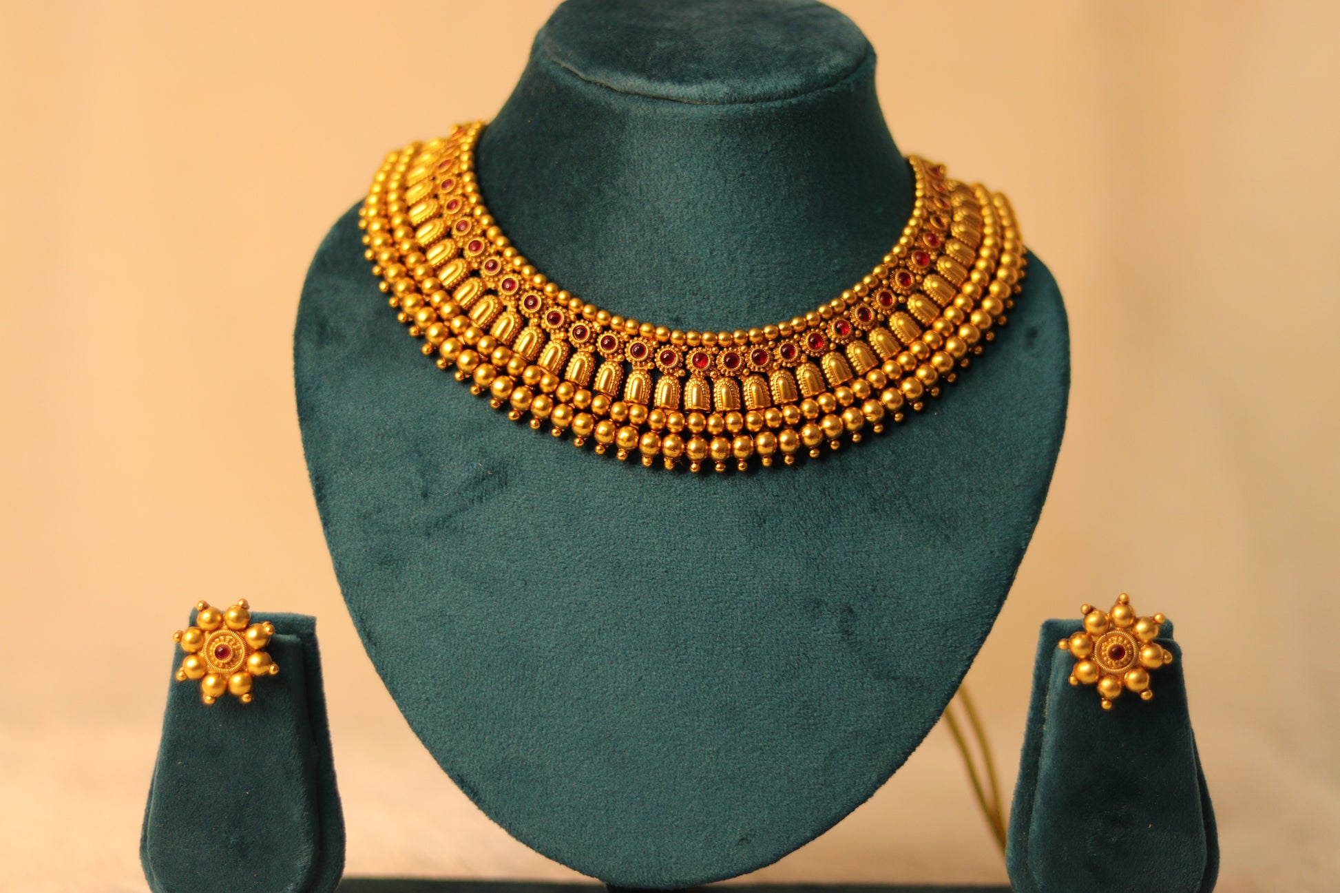 Premium antique gold plated bridal choker necklace set with layered bead work and red stone embellishments. Comes with matching earrings, ideal for weddings, festive occasions, and traditional functions.